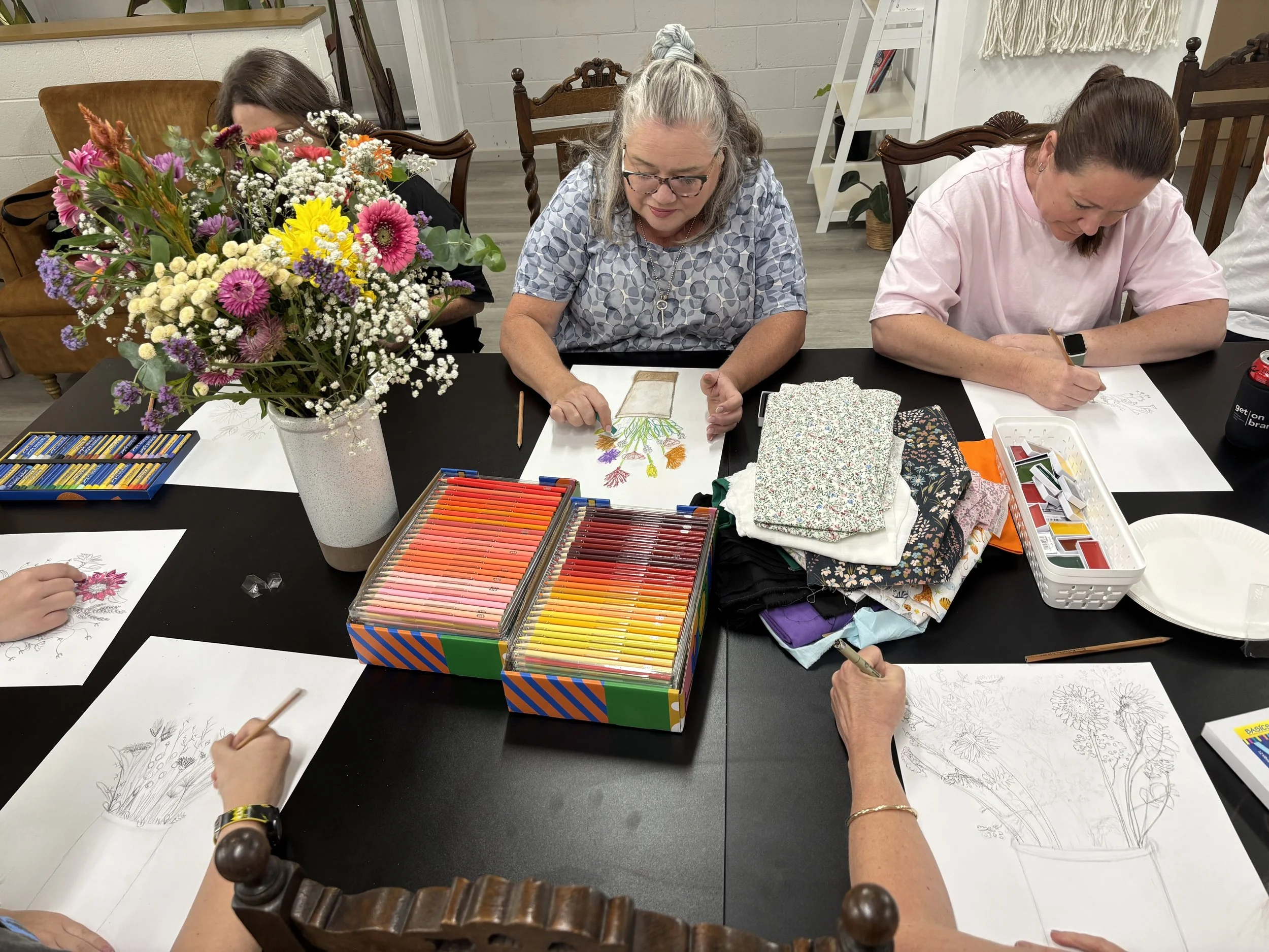 Each session begins with a gentle mindfulness or guided meditation to help participants arrive and settle into the space. This is followed by a longer period of individual art-making, where everyone works on their own pieces while creating side by side.